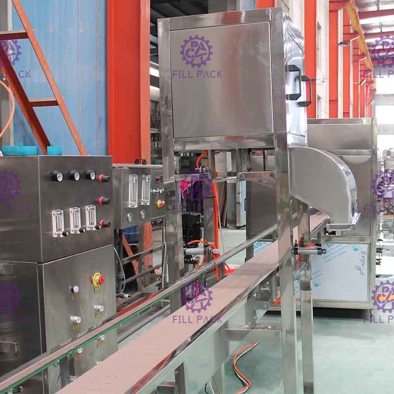 De hele 5 vat bottelarijlijn omvat Automatische ontkrooner, Roterende externe wasmachine, L-type Wasmachine/Vuller/Afsluitmachine, Warmtekrimpmachine, Controlelamp, Inkjet code printer.