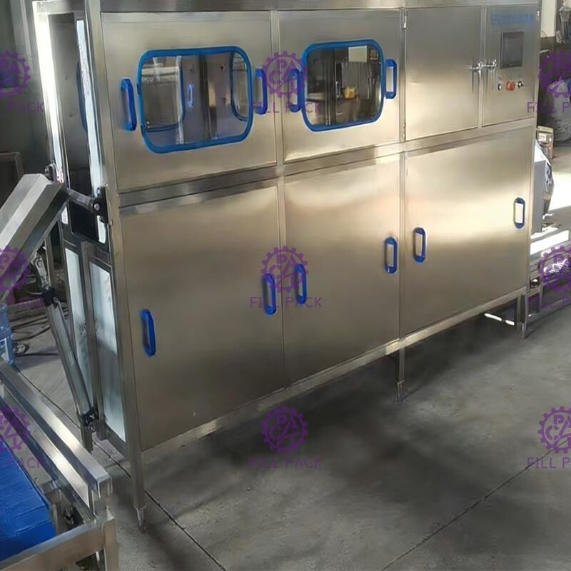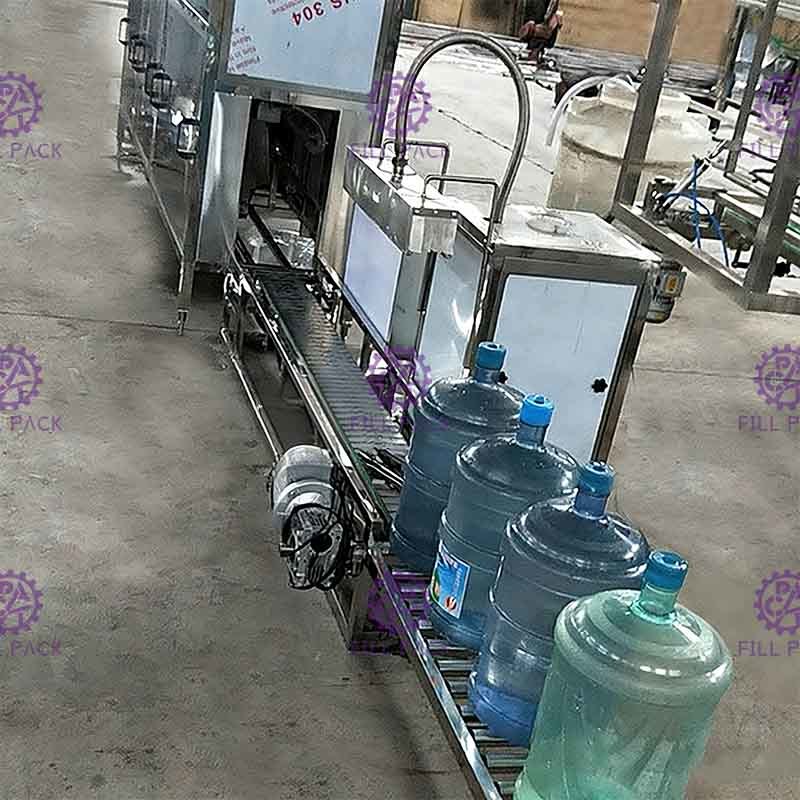 De hele emmer water afvullijn omvat Semi-automatische ontdekselaar en wasmachine, Monoblock spoel-vuller-dopmachine,Roller transportband, Label krimptunnel, Controlelamp,Solid Ink Roll Codeermachine