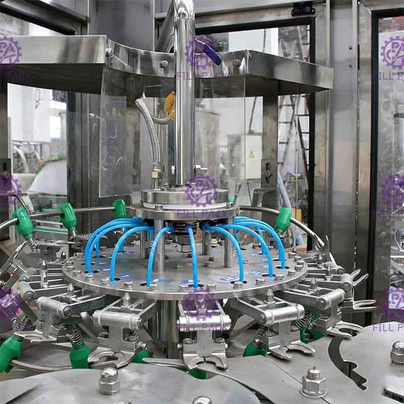 Veerklemmen worden gebruikt in het fleswasproces. De lege flessen kunnen 180° worden omgedraaid langs de transportrail. Er zijn twee keer intern en extern wassen, de efficiëntie van het fleswassen is hoog. Het vullen door een vloeistofniveau-regelende vulklep van het veertype, geen druppelen. Het vloeistofniveau is gemakkelijk te controleren. Alle constructie gemaakt van SUS304, Er is geen dode hoek in de vulklep. De magnetische torsie wordt gebruikt voor het schroefdop. De kracht van de schroefdop kan zonder stappen worden aangepast. De kracht van de schroefdop kan ook worden vastgezet en de doppen worden niet beschadigd, het afdichten is betrouwbaar. De hele machine wordt bestuurd door PLC met touchscreen als de mens-machine-interface. De hoeveelheid drank in de opslagtank kan automatisch worden geregeld. Het vullen en afdichten stopt automatisch wanneer er geen fles is. Wanneer flessen verkeerd worden vastgeklemd of wanneer er geen doppen beschikbaar zijn, kan de machine automatisch worden gestopt. De frequentie-veranderingstechnologie wordt gebruikt om de werksnelheid traploos aan te passen. De productiecapaciteit kan digitaal worden weergegeven en kan gemakkelijk worden aangepast.